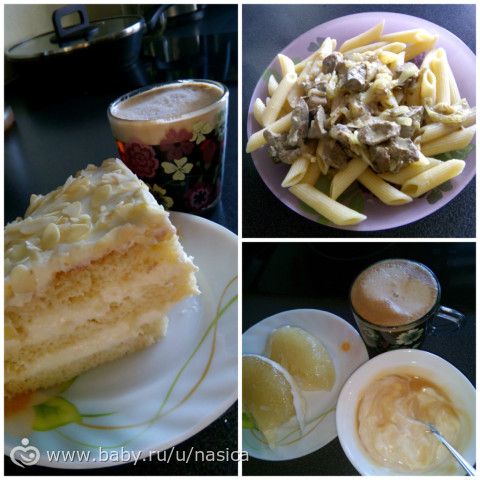 Обед: не системный, но три дня о нем мечтала! Макароны с тушеной печенкой и луком в сметане. Чай