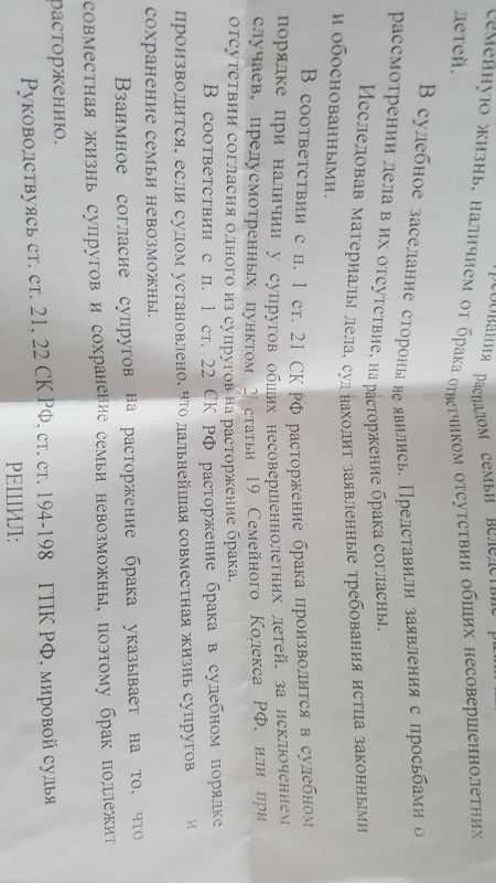 Спасибо за ответ. а что вы писали в заявление, какую причину развода? у нас — не обеспечивает нас и не проводит время вообще с семьей, все деньги спускает на родителей своих и на свои нужды. и вы приходили оба в суд? девушка выше написала, что можно и без присутствия развестись