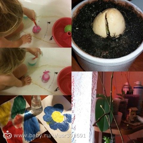 На прогулке сегодня сорвали веточку липы, теперь будем наблюдать, как распускаться будет)) еще я недавно косточку авокадо прорастила и посадила в горшок, она уже треснула, ждем появления росточка.