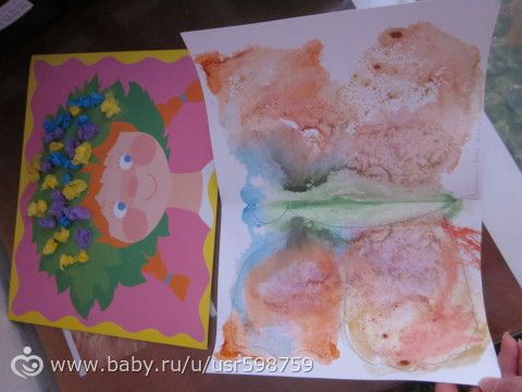 2. Монотипия. Сделали-таки бабочку! (понятно там, что это бабочка?) Сложность была в том, что краска высохла пока мы дорисовали и не хотела уже отпечатываться. Мы водой смочили и получилось. Не так красиво как на образцах, но всё же. Потом дочка меня отогнала и нарисовала еще парочку картин, даже в трубочку их сворачивала потом))
