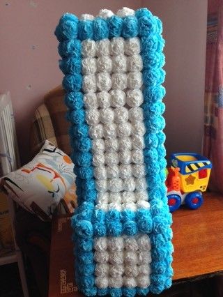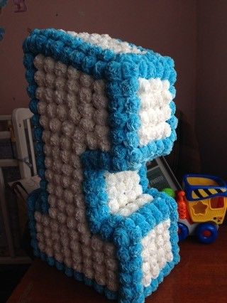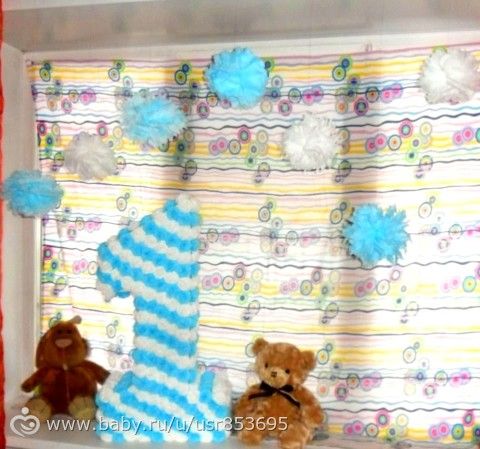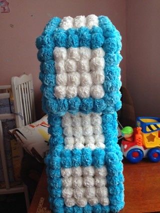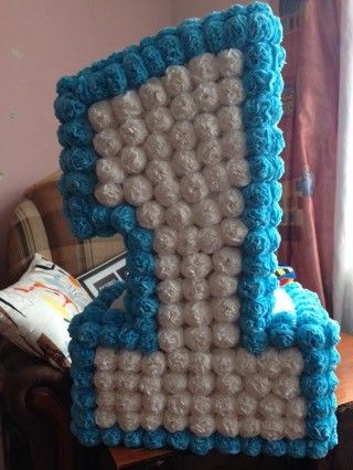Единичка на годовасие! Сперва мне муж мделал каркас из картона, склеил все малярным скотчем и дальше началась моя работа. Сперва я ед обклеива всю белами салфетками и потом только коеила цветочки. Про цветочки, берем салфетку( белые у меня были двухслойные синии однойслойные) складывала пополам, вырезала круг и брала по два или три слоя как получиться, как вам больше ноавиться и сжимала пальцами и так пока не получиться цветочек и потом клеила на момент