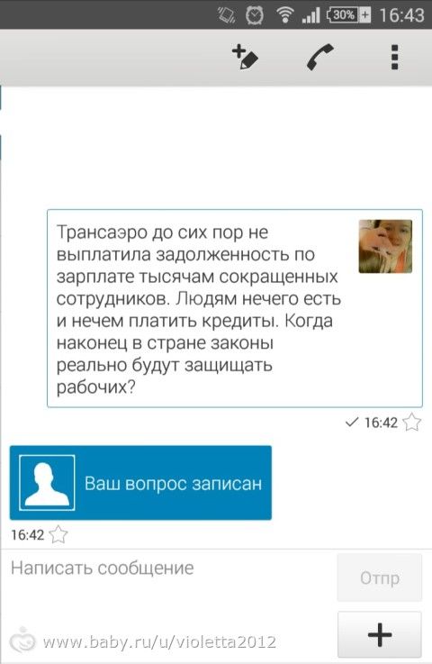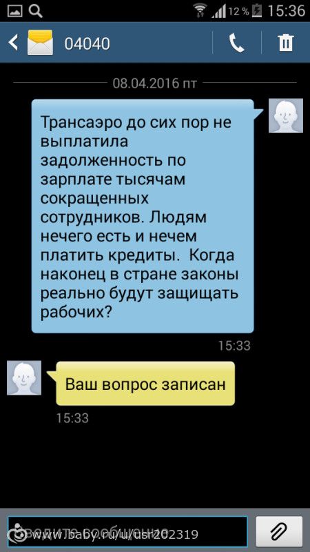 Прямая трансляция будет 14 апреля, а уволенным сотрудникам не выплатили до сих пор задолженность.просьба поддержать нас в этом вопросе, чтоб нас услышали! Отправьте на бесплатный номер 04040 текст: Трансаэро до сих пор не выплатила задолженность по зарплате тысячам сокращенных сотрудников. Людям нечего есть и нечем платить кредиты. Когда наконец в стране законы реально будут защищать рабочих? Будем очень благодарны.р.с: муж бывший сотрудник Трансаэро. Если есть кого попросить отправить-было б здорово. Заранее спасибо. я отправила, вышло вот что: