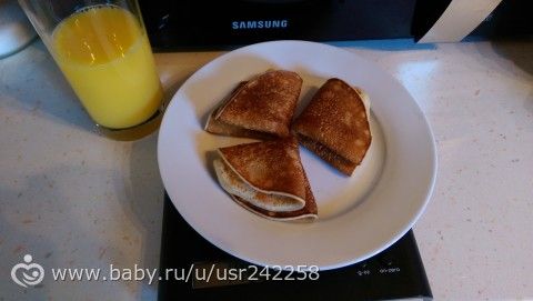 Блинчики, обычные (уже почувствовала всё глупость своего поступка поджелудочной, но так хотелось))))). Кофе с молоком, потом блинчики с клубничным джемом, 142 грамма и потом сок апельсиновый.