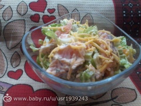 Если кого-заинтересует состав: пекинская капуста, помидор, семга слабосоленая, сыр. Перемешала с майонезом с добавлением капельки лимона и укропа.
