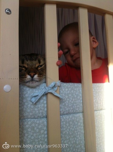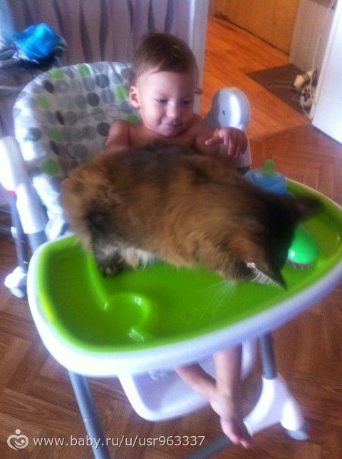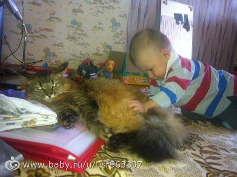Мужу заявила, что Кота надо срочно утилизировать, волосня ж кургом, да и видно было что он любитель детских мест прибывания. Утилизировать — отдать в смысле в добрейшие руки))) Ребенок был недоношенный и был вдвое меньше Кота, я боялась, что кот съест ребенка!!! Но. Все прошло наилучшем образом, они вместе спали) не прям в обнимку, просто рядом, ребенку нравился мягкий кот, от всегда был рядом на расстоянии вытянутой руки, благодоря коту ребенок пополз, тк кота надо было погладить, он за ним ползал, тот не давался гладится, и уже ребенку 2 г 3 м они лучшие друзья, он его целует))) за все время ни разу ни поцарапал, ни куснул( хотя умеет). Любит кормить Кота и обожает под присмотром и помощи мамы убирать лоток.