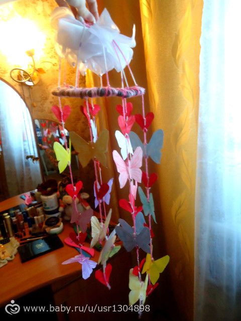 ещё любит когда в кроватке лежит смотреть на мобиль с бабочками который я своими руками сделала