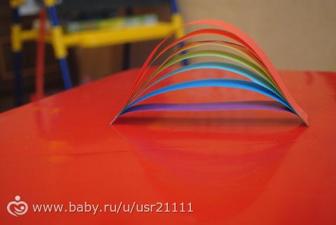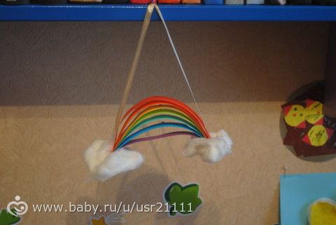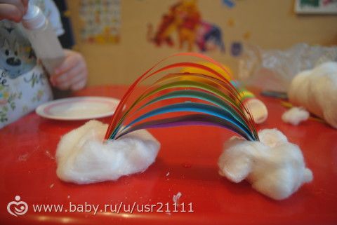 Еще мы делали поделку радуга) Я сделала заготовку, а вместе с Полей мы сделали облачка из ваты)