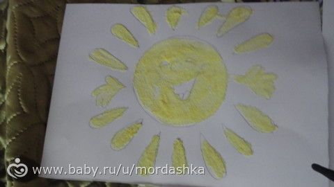 Солнышко делалось в любимой «технике» насыпания разноцветной соли на рисунок )) Правда дорисовывать лицо солнышку лень ей стало (((