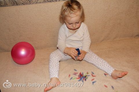 А вечером я дала ей коробочку со скрепками. Задание было не простым, нужно скрепку опустить в контейнер через дырку, но так как в дырке стоял магнит то скрепки постоянно к нему примагничивались и Валюше приходилось их проталкивать. Это очень хорошее занятие для мелкой моторики.
