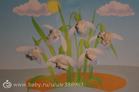 Первые цветы, которые мы увидели весной -подснежники. Когда мы шли утром в садик, всегда махали им «привет» и они нам дружно кивали. Поэтому к этому заданию мы сделали аппликацию с помощью салфеток «Подснежники»