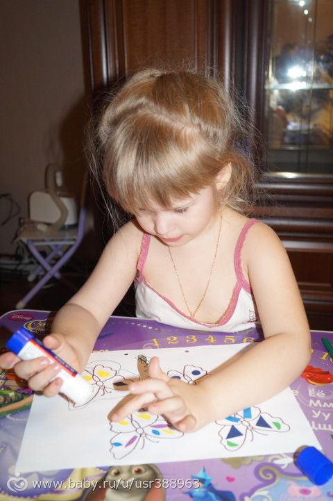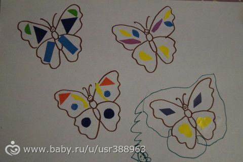 Дочка украшала крылышки бабочек по образцу. Я наклеила фигурки на одно крыло, дочка повторяла рисунок на втором.