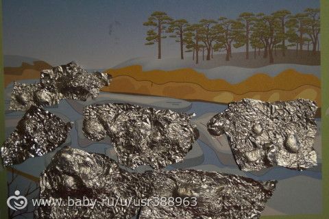 А еще поговорили про ледоход, как лед трескается и тает на реке. Сделали льдины из фольги.