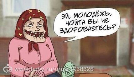 Весна...около подъездов появились первые бабки)! 21 апреля 2016 15:31 Комментарии Пожалуйста, будьте вежливы и доброжелательны к другим мамам и соблюдайте правила сообщества ПожаловатьсяСкопировать ссылку HipnoGato AngryKid13 лет Санкт-Петербург Да тут круглогодично полно таких бабок с рассуждениями 2Эх, молодежь. вот я в их годы...". ПожаловатьсяСкопировать ссылку Shewolf Мытищи мы в таком месте живём, что даже бабки не решаются у нашего подъезда задерживаться, уходят в глубины домов) ПожаловатьсяСкопировать ссылку Кристина Артём10 лет Киев ПожаловатьсяСкопировать ссылку Юлия Никита17 летКсения10 лет Москва А у нас сидят прикольные бабки)) Одна бывшая стюардесса Аэрофлота, вторая переводчица в МИДе. ПожаловатьсяСкопировать ссылку Дашунчик Марианна10 лет Саранск Они у нас и зимой сидят, никакие морозы их не пугают) Предыдущая статьяЧастные сады, Москва. После 1,5 лет дети перестают есть и пить?Следующая статьяВ 2017 г. в школу...вопрос про подготовительные занятия. Москва.
