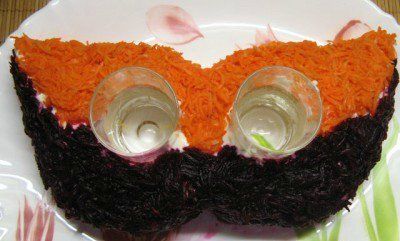Именно в форме маскарадной маски предлагаю вам подать на стол оригинальный слоёный салат.