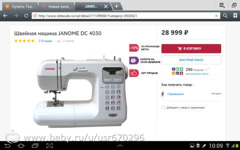 Ой, начну с похвастушек!)Загорелась я месяц назад идеей покупки швейной машины(никогда не шила, если только в школе на трудах классе в 7-ом), а тут приспичило капец)))Выбирала, отзывы-обзоры смотрела, остановилась на Janome DC 4030(только вот покупать планировала через инет, там, кстати, значительно дешевле она бы обошлась, тысяч в 17-18).Влюбилась в нее просто!