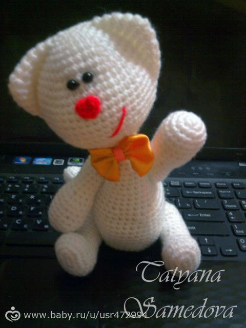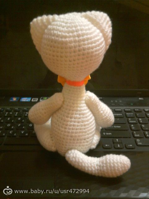 Качество блин стремное, фоткала на телефон ночью, лень было всякие приготовления устраивать, а сфоткать надо было, ибо с утра игрушку торжественно вручила дочке ну и сами понимаете, что с ней будет через 2-3 дня. Когда вязала игрухи для розыгрышей, Стаська так и крутилась вокруг, вес просила поиграть, обещала ей связать другую. Вот он, кот-обормот… Руки-ноги-хвост двигаются, голову тоже можно поворачивать как вздумается. Страшон, конечно, страшон )))) Не набила я еще толком руку на игрушки, ненавижу крепить конечности