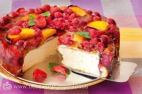 5. Выложить на торт фрукты и/или ягоды — свежие или консервированные. Залить их желе — два стакана сиропа, в котором бланшировались фрукты и 1 стакан распущенного желатина (2 ст.л. желатина на 1 стакан воды).