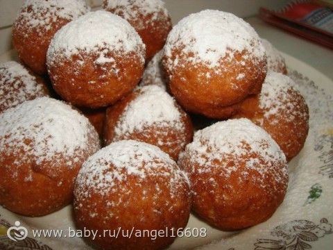 В кастрюльку с горячим растительным маслом погружаем первую порцию шариков, деревянной ложкой помогаем им всплыть. Жарить лучше на среднем огне, дав им прожариться внутри и не дать сгореть снаружи. Жарим до золотистого цвета. Готовые шарики складываем в дуршлаг, чтобы стекло лишнее масло, потом перекладываем на блюдо и уже остывшие посыпаем сахарной пудрой.