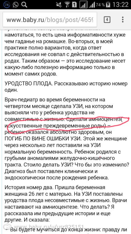 Врач-педиатр во время беременности на четвертом месяце сделала УЗИ, амниоцентез, на котором выяснили что у ребенка уродства не совместимые с жизнью. Сделали искусственные преждевременные роды – ребенок оказался абсолютно здоровым, он ПОГИБ ПО ВИНЕ ОШИБКИ УЗИ. Этой же женщине через несколько лет поставили на УЗИ нормальную беременность. Ребенок родился с грубыми аномалиями желудочно-кишечного тракта. Стоило делать УЗИ? Что бы это изменило? Диагноз был поставлен клинически и эндоскопически после рождения ребенка.