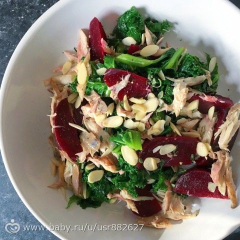 Скумбрия и свекла сочетание просто бомба! :) добавить туда зелени и вообще отлично. Салатик из запеченной свеклы и скумбрии с кудрявой капустой, тимьяном и миндалем. Вот на счёт миндаля вопрос спорный. Муж не переносит орехи в еде, потому что ему кажется, что попалась косточка. Если у вас такого бзига нет, то очень вкусно :) рецепт писать не буду. Свеклу и рыбу запечь, Капусту отварить быстро (можно заменить на шпинат). Все смешать, посыпать соль, перцем, тимьяном и орехами. Кому надо добавить масла, но как по мне это не надо, так как рыба сама по себе жирная.