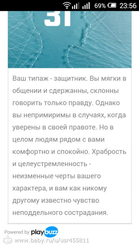 Вы прирожденный воспитатель. Вы способны создать порядок из хаоса, тактичны по отношению к окружающим и склонны всегда смотреть на светлую сторону. Вы постоянно стараетесь сопереживать чувствам других людей. Вы ориентированы на семью, щедры и больше всего цените в людях открытость.