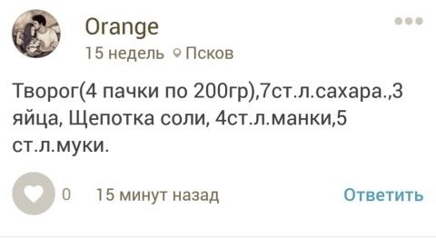 Творог(4 пачки по 200гр),7ст.л.сахара.,3 яйца, Щепотка соли, 4ст.л.манки,5 ст.л.муки.