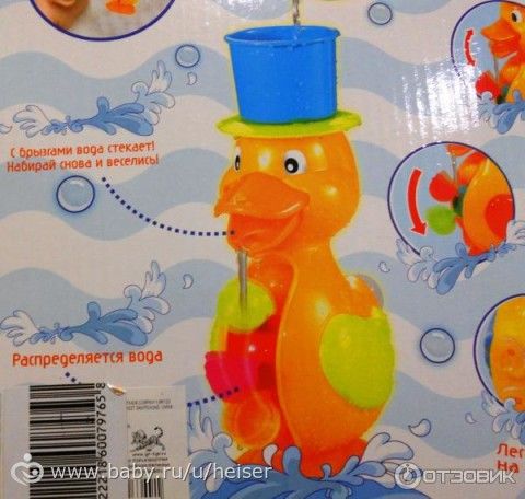 у нас вот такая утка. крепится к стене на присосках. есть стаканчик, которым воду в шляпу наливаешь. вода вытекает из клюва и крутит колесо с «чашечками». доча до сих пор иногда его просит повешать