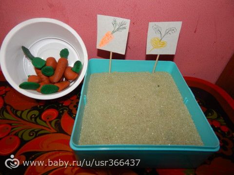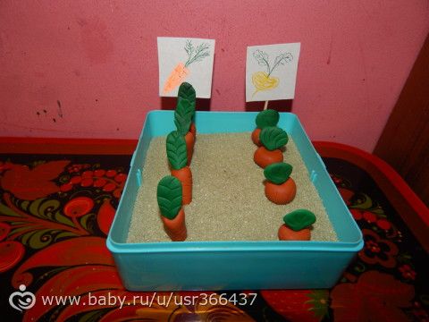 Грядка с урожаем и куст. Куст в процессе — ещё листики будут. Дочка больше часа сажала и собирала урожай! Перерыв небольшой и дальше сажает. Собирается поливать — делаю лейку из пластилина)