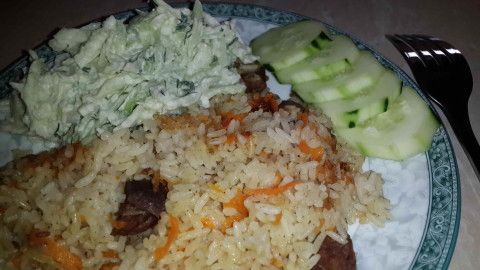 Любой рис, уже готовое мясо и зажарка. Воды наливаю столько чтоб почти покрыло. Перемешиваю, закрываю крышкой и в духовку на час! Плов пропареный, совсем не жирный и рассыпчатный!