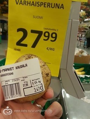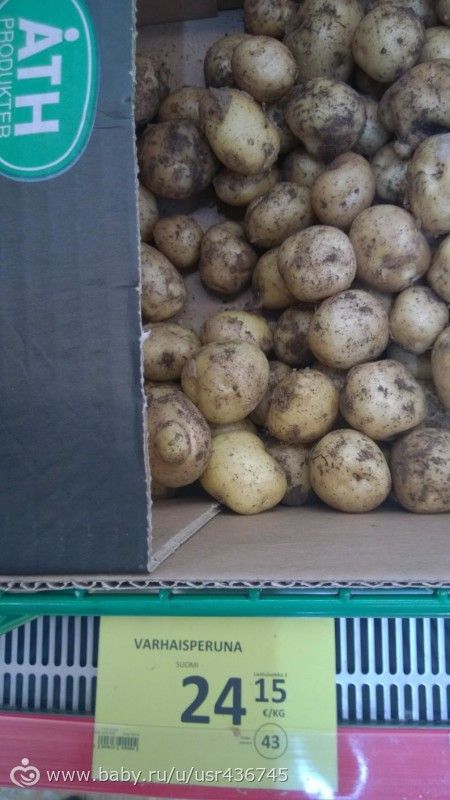Екатерина, Вообще у нас нормальная цена для картошки примерно 90 центов-1 евро. :) Это просто самая первая местная финская картошка. Привозная, Испанская или голландская намного дешевле.