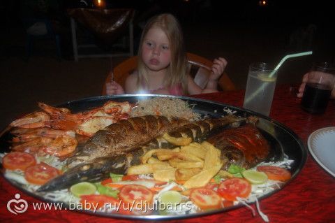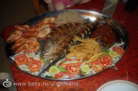 Ещё на пляжных вечеринках мы заказывали рыбную тарелку — 3 королевских креветки (см 10 длиной), штук 10 средних, гарнир и три разных рыбины — 3000-3500 рупий. На 3 взрослых и ребенка — такой тарелки нам было предостаточно, а на 2х взрослых с ребенком — мы вообще выкатились из-за стола, как колобки)) Вот тарелку я сфоткала)))