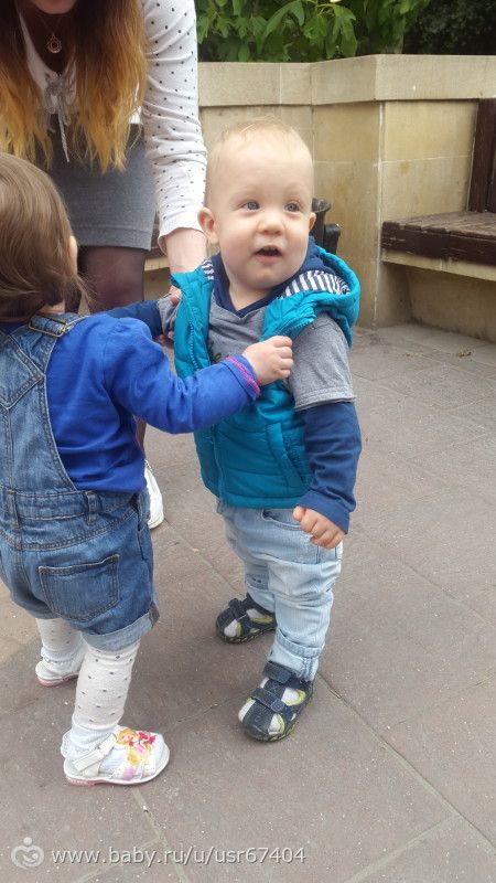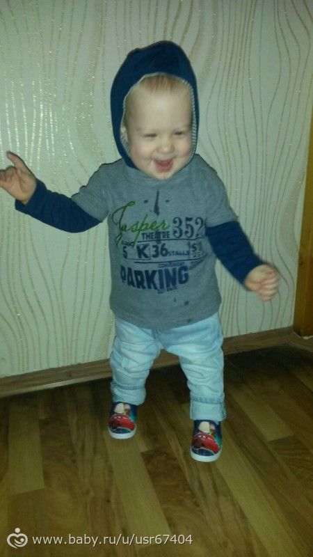 Дома уже уверенно ходит сам, правда всего 6-7 шагов делает, потом на попу приземляется)) Но такой смешной когда ходит, ворчит как старый дед))))