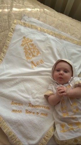 Спец костюм для крестин и полотенце. Это все потом не стирают!!! Если ребенок плохо спит или не дай Бог болеет можно укрыть или одеть!!! Это нам в церкви сказали