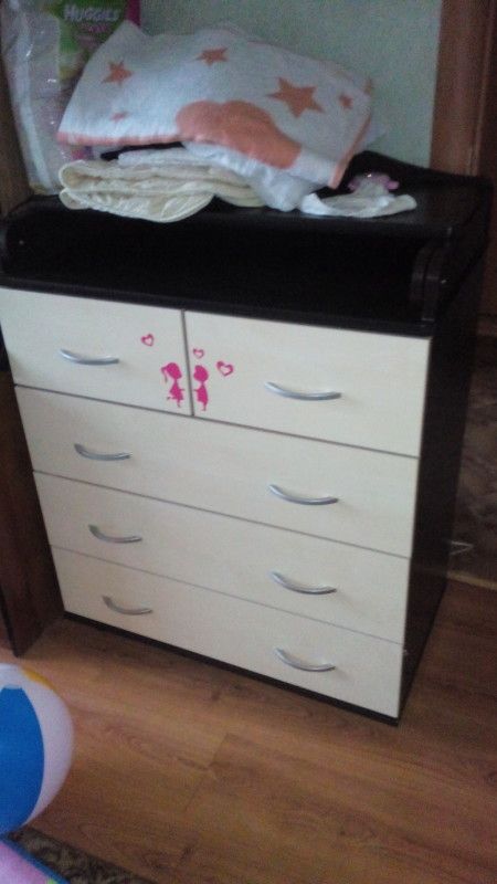 Откидным вверзом от комода пользовалась месяц, удобнее пеленать было на кровптке))) щас использую как полку и чисто комод для белья ребёнка, брала за 3200 нов