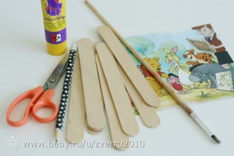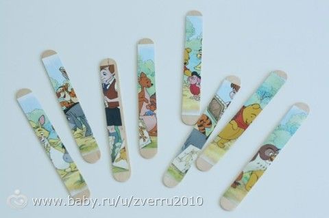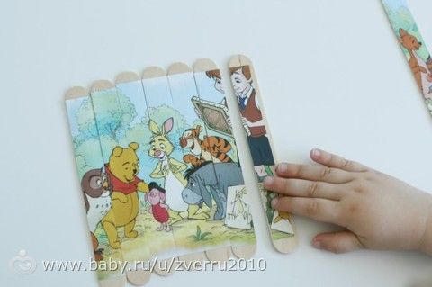 Из деревянных палочек для мороженого (или медицинских шпателей) и картинки, распечатанной из интернета или вырезанной из старого ненужного журнала, можно сделать увлекательную игру на развитие наглядно-образного мышления у детей.