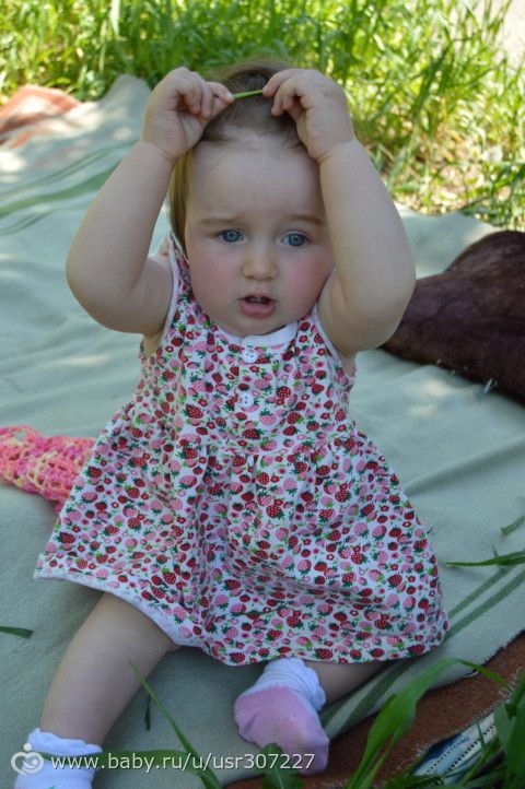 Я просто в шоке… Уже 11!!! месяцев.Через месяц год)) Время остановись! Я так хочу, чтобы моя булочка была мааааленькой)) В общем, сегодня нам 11 мес)) Отметили мы это дело падением с кровати ((( проснулась и молча уползла, обычно всегда начинает хныкать, что рядом никого… Ну короче, я проворонила(( Разбила губу и нос поцарапала(( Пипец(( Такой у нас сегодня раненый ДР )) К 11 мес Уля: ходит отлично за ручку, делает 5-6 шагов самостоятельно, показывает пальчиком, нюхает цветочки, показывает глазки у игрушек, прячется за торкой или одеялом )) Ест… ВСЕ! Да, закидают меня тапками))Мы уже на общем столе, смесь едим 1 раз рано утром или ночью, если просыпается, а так ест все, что мы )) Очень любит репчатый лук, чеснок и зеленый лук)) Вес, рост не знаю, так как мы в KZ до сих пор отдыхаем))