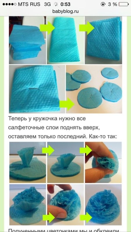 Складываешь салфетку в 2 раза, чертишь круг, степлеришь по центру, вырезаешь и потом по 2 листочка сминаешь к центру