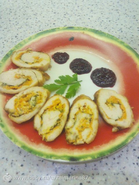 Сделала сегодня куриные рулетики, дочке очень понравилось! Хотя накормить ее это ужас какой то. А тут свою порцию съела, ко мне в тарелку залезла и еще 3 раза попросила)))
