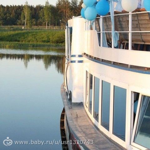подружка с мужем постарались, палубу шариками и лентами украсили, все в бело-голубом стиле.