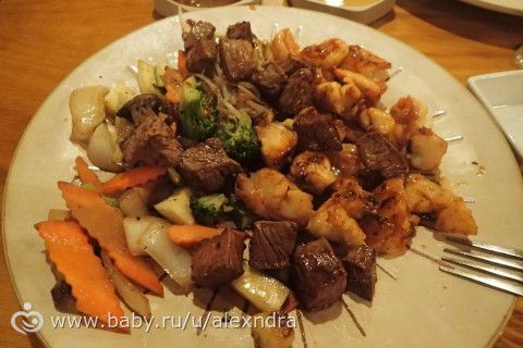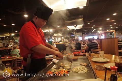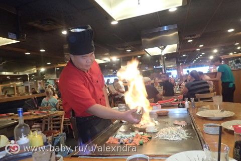 Приготовление еды на гриле превратилось в целое шоу, мы заказали жареный рис, овощи, стейки, креветок и лобстера, когда началась готовка — дети забыли про суши.