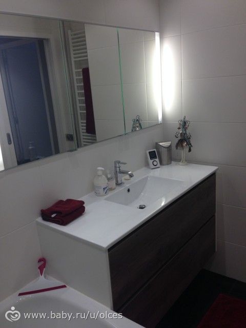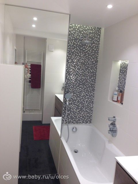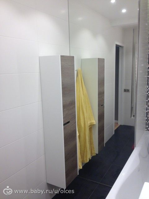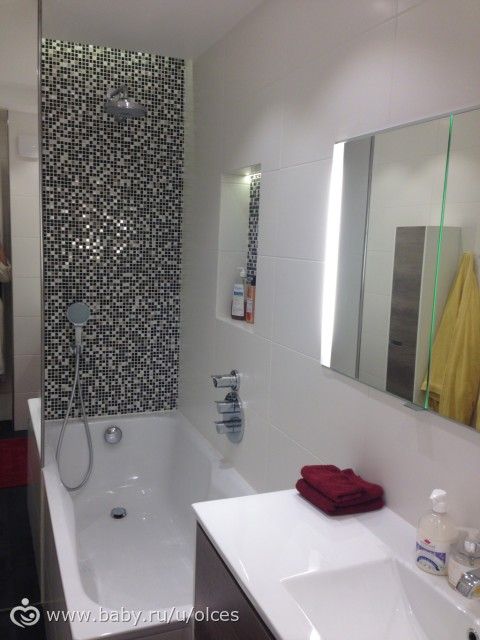 1. Что касается цветовой гаммы, я решила использовать белый цвет, как основной, так как естественного света у нас нет, и объемы достаточно маленькие (ванная около 5м). Также обязательным условием было наличие большой ванной, так как я сама люблю полежать и с ребенком удобнее. Но утром мы принимаем душ, так что душевая тоже нужна! А места мало. Но мы и тут нашли решение, смортите ниже.