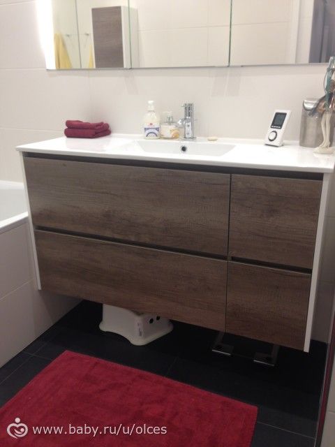 Маленький навесной шкафчик, шел в комплекте с тумбой, долго думала, вешать его или нет, но все же повесили. Там у нас бытовая химия, всякие редкоиспользуемые вещи и внизу игрушки для ванной. Плюс за ним прячутся халаты.