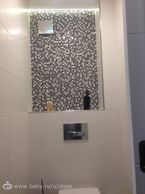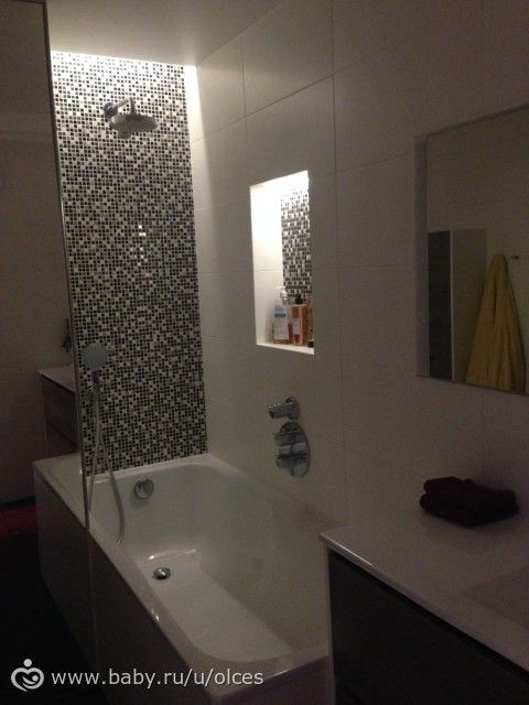 4. Мозаика и ниша. Чтобы ванная не выглядела слишком стерильно белой, я использовала мозаику. Она очень украсила стену и красиво переливается при подсветке. Так как все трубы мы спрятали в стены, мы смогли сделать нишу для декора и шампуней, а также встроить наш шкафчик в стену.