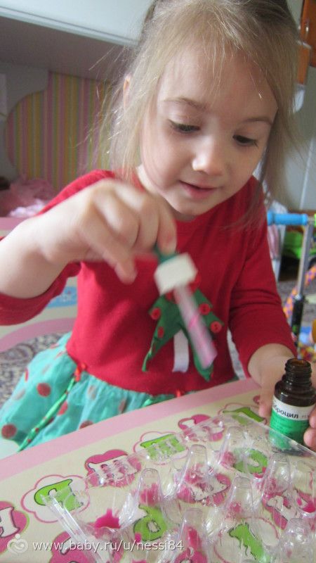 Пришел к нам зайка и заказал сделать ему по рецепту лекарство. Капали пипеткой подкрашеную воду в лоток от яиц. Смешивали розовый с синим и смотрели, что получился новый оттенок.