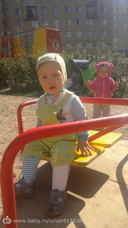 Любит смотреть на себя в зеркало, видео и фото с собой любит, сразу улыбается и болтает:) Стали гулять на площадке (да, только сейчас) 15 минут топаем, катаемся на качелях, лошадке и карусели. Причем последнюю он сначала катает, ходит вокруг, как бы раскатывая, а потом забирается и усаживается:)