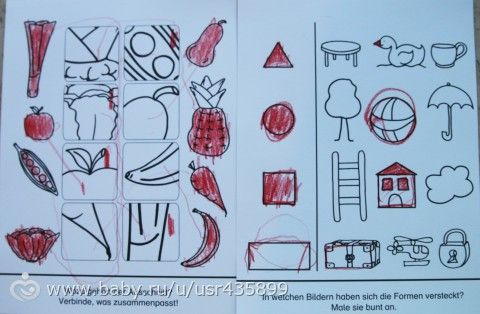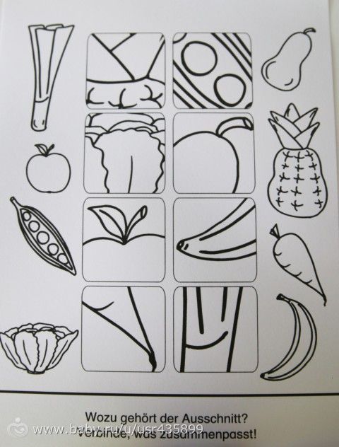 2. Нужно было найти какой фрукт или овощ «спрятался» в картинке-квадрате. Дочь еще дополнительно сама решила раскрасить, правда одним цветом все, и соединить линией. Это задание выполняли долго. Почему-то возникли сложности в нахождении груши и гороха.