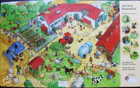 3. Задание было не запланировано, я взяла книгу только в библиотеки, но дочь сама захотела поискать и мы вместе еще искали то, что справа от картинки в кружочке. Сама нашла, без моих подсказок ровно половину — мышку, собаку, мальчика и козу. Ну и сама по себе картинка познавательная — фермерский двор. Здесь уже можно бесконечно что-то придумывать, рассказывать, показывать, считать, искать и т.п. Но мы вчера ограничились только поиском.