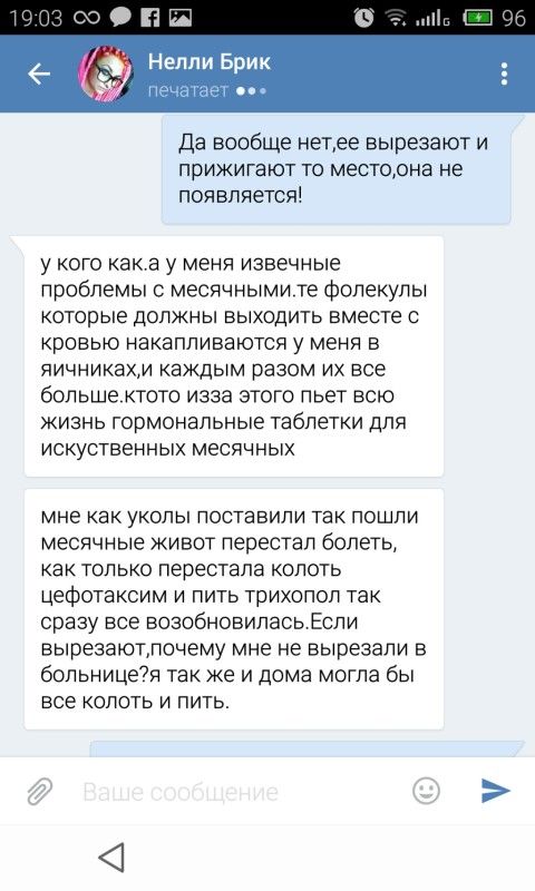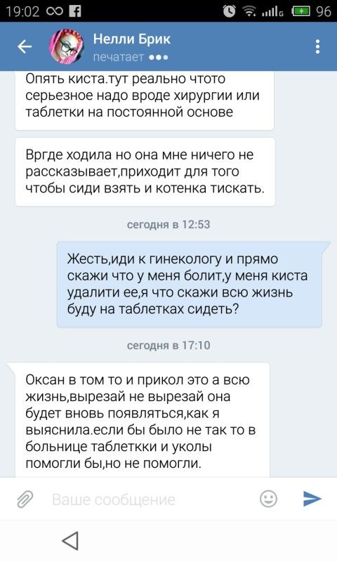 У нее киста правого яичника, по фото это я с ней переписываюсь
