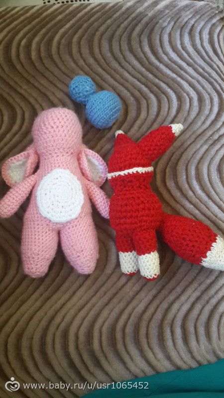 на синюю фиговину убила часа 4 пытаясь понять как вязать вообще)красное нечто вроде лисы было вторым, розовая овечка хоть и кривоватая, но мне нравится))и зеленая штука это кактус вроде)не так сложно как казалось, в целом часов 7 ушло на то чтоб разобраться)сейчас вяжу пинетки дочке)потом пойдут носочки побольше)