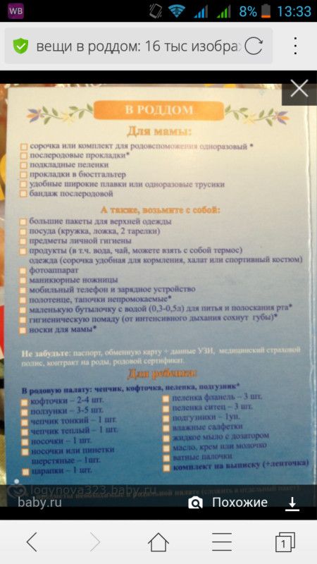 На роды брала воду и гигиеническую помаду. Потом пока лежала 2ч после родов, муж привез пакеты заранее собранные. Там: халат, ночнушка, шампунь, мыло, полотенца, щетка, паста, тарелки, ложка, вилка, кружка, прокладки, бюстгалтер, расческа. К выписке привез фен, косметику и одежду нам с сыном. Всё было удобно разложено по пакетам